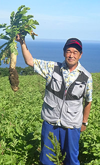 農事組合法人 舮作(へなし)興農組合は昭和51年青森県深浦町の漁師が「黄金崎」といわれる海岸段丘地(標高50〜200m)を活用した農業を行うために設立した農事組合法人です。結成当時は大根栽培に取り組み、一次加工施設を設置し契約栽培を始めました。経営規模の拡大の中で、根菜類の緑肥栽培を組み入れた輪作体系を確立し、朝日農業賞を受賞しました。現在はブランドにんじん「ふかうら雪人参」の栽培を中心に安全で安心な農作物栽培に取り組んでいます。